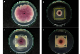 Gambar 1. Aktivitas antifungal terbaik terhadap Fusarium sp. oleh isolat bakteri endofit. A) Pertumbuhan Fusarium oxysporum f.sp. lycopersici, B) isolat A1, C) isolat B1, D) isolat C1. Menguak Rahasia Mikrobiologi ...
