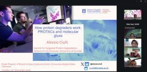 Dalam kuliahnya, Prof. Ciulli memaparkan perkembangan terbaru teknologi PORTAC (PROteolysis TArgeting Chimeras) molekul bifungsional yang memicu degradasi selektif protein penyebab penyakit melalui sistem ubiquitin–proteasome. Teknologi ini menawarkan keunggulan signifikan dibanding obat konvensional, termasuk kemampuan menargetkan protein “undruggable” dan efek terapeutik yang lebih berkelanjutan.